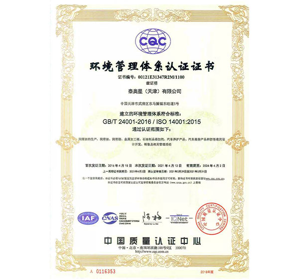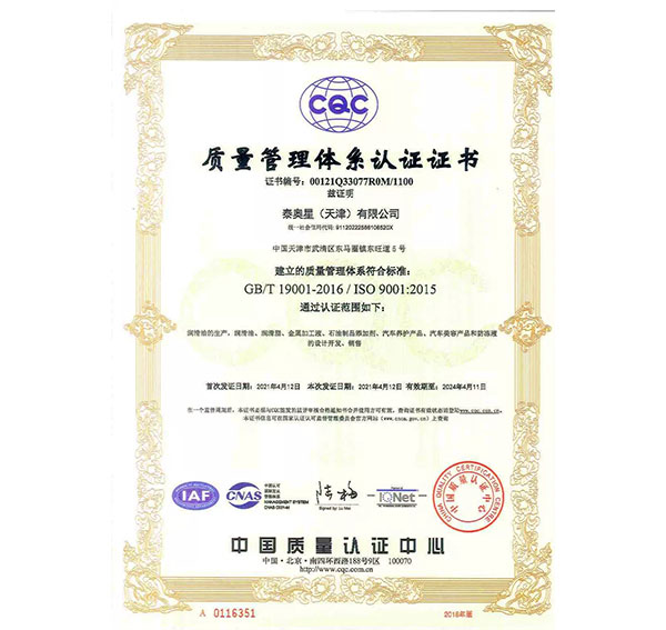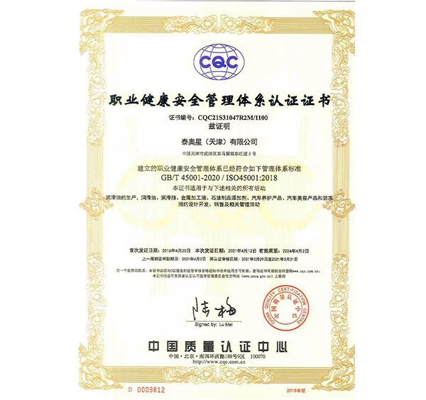 多年來,泰奧星堅持質(zhì)量至上的經(jīng)營理念,先后通過了ISO9001質(zhì)量管理體系、ISO14001環(huán)境管理體系和、OHSAS18001職業(yè)健康安全管理體系及IATF16949質(zhì)量管理體系四大體系認證。嚴格的質(zhì)量控制體系保障了公司產(chǎn)品質(zhì)量穩(wěn)定優(yōu)良,近年來,泰奧星先后被認定為CMMC中國潤滑材料行業(yè)十強、全國潤滑十佳企業(yè)、中國綠色低碳先鋒企業(yè)等。