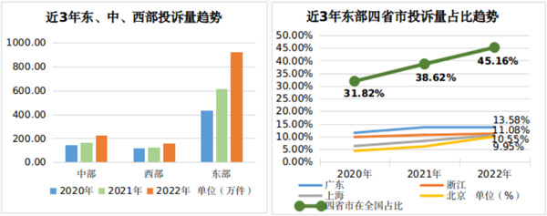 從近三年趨勢看,因平臺(tái)經(jīng)濟(jì)的跨區(qū)域擴(kuò)張、人口資本的跨區(qū)域流動(dòng)、市場要素的跨區(qū)域配置,廣東、浙江、上海、北京4個(gè)省市的消費(fèi)正在加速集聚。消費(fèi)投訴數(shù)量與消費(fèi)活躍水平呈正相關(guān)關(guān)系,四省市消費(fèi)投訴數(shù)量在全國的占比從2020年的31.8%增長到2022年的45.16%。消費(fèi)投訴的加速集聚在一定程度上反映了消費(fèi)供給側(cè)發(fā)展的不平衡,需要進(jìn)一步恢復(fù)和擴(kuò)大中西部地區(qū)消費(fèi),推動(dòng)更高質(zhì)量、更加平衡的發(fā)展。