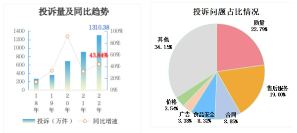 2022年,全國市場監(jiān)管部門受理消費(fèi)者投訴1310.38萬件,同比增長43.84%,增速較2021年有所放大。從投訴問題看,質(zhì)量298.70萬件、售后服務(wù)248.96萬件、合同115.91萬件、食品安全109.06萬件,合計(jì)占投訴的58.96%。其中,售后服務(wù)問題增長最快,群眾反映最強(qiáng)烈,同比增長57.67%。
