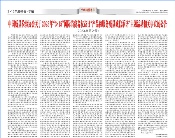 中國經(jīng)濟(jì)網(wǎng)北京3月15日訊(記者 佟明彪 蘇蘭) 春來潮涌,奮楫揚(yáng)帆。在2023年“3·15”國際消費(fèi)者權(quán)益日到來之際,中國質(zhì)量檢驗(yàn)協(xié)會(以下簡稱質(zhì)檢協(xié)會)組織開展2023年“3·15”“產(chǎn)品和服務(wù)質(zhì)量誠信承諾”主題活動,包括中國航天科技、格力、美的、紅九九、名臣健康、安莉芳等各行各業(yè)2000多家優(yōu)秀企業(yè)積極響應(yīng)參與,在推動經(jīng)營者質(zhì)量誠信自律、維護(hù)消費(fèi)者合法權(quán)益、持續(xù)優(yōu)化營商環(huán)境等方面展現(xiàn)了質(zhì)量領(lǐng)域社團(tuán)組織在新時代的新作用。