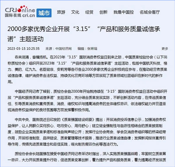 中國經(jīng)濟(jì)網(wǎng):2000多家優(yōu)秀企業(yè)開展“3·15”“產(chǎn)品和服務(wù)質(zhì)量誠信承諾”主題活動
