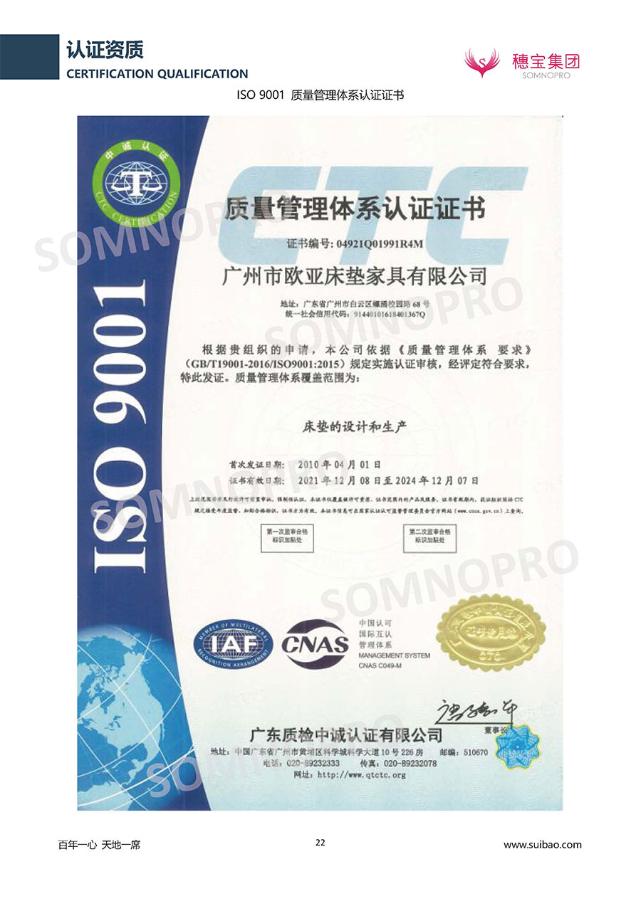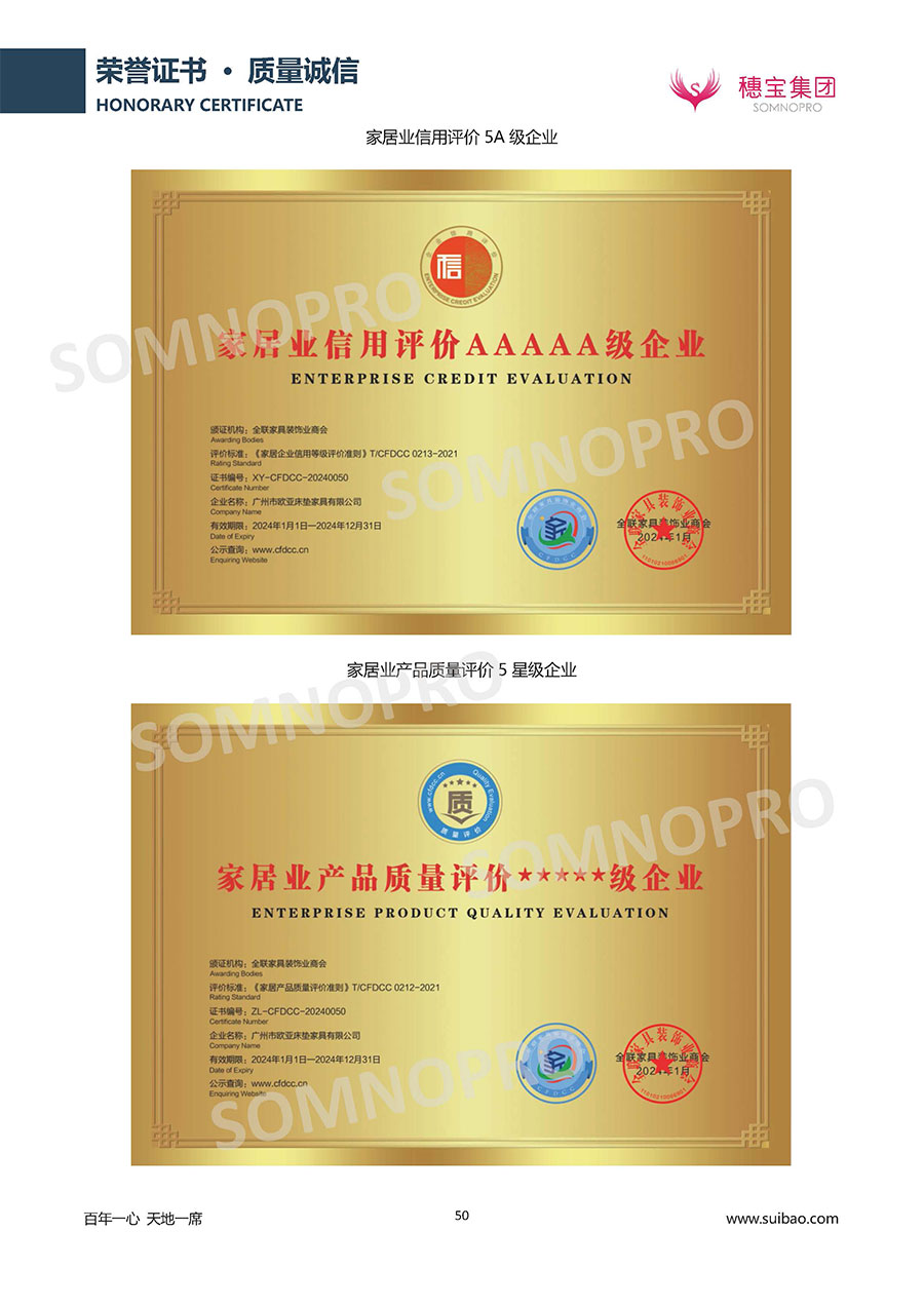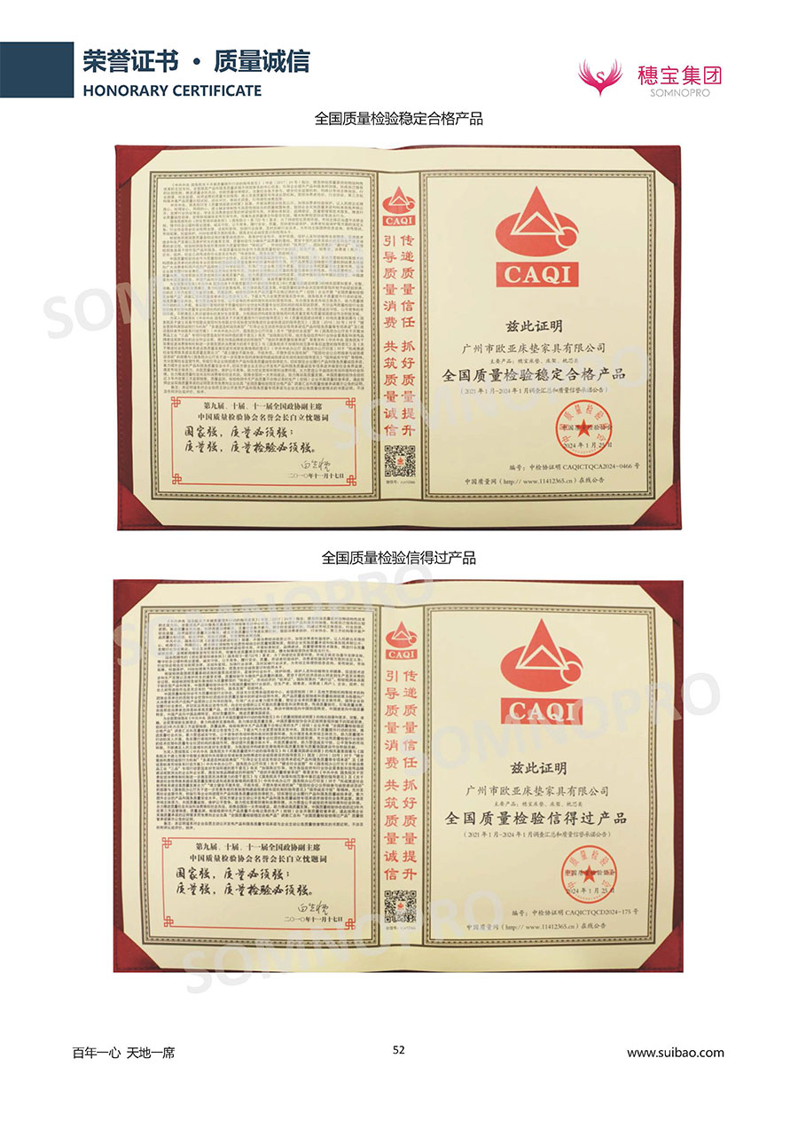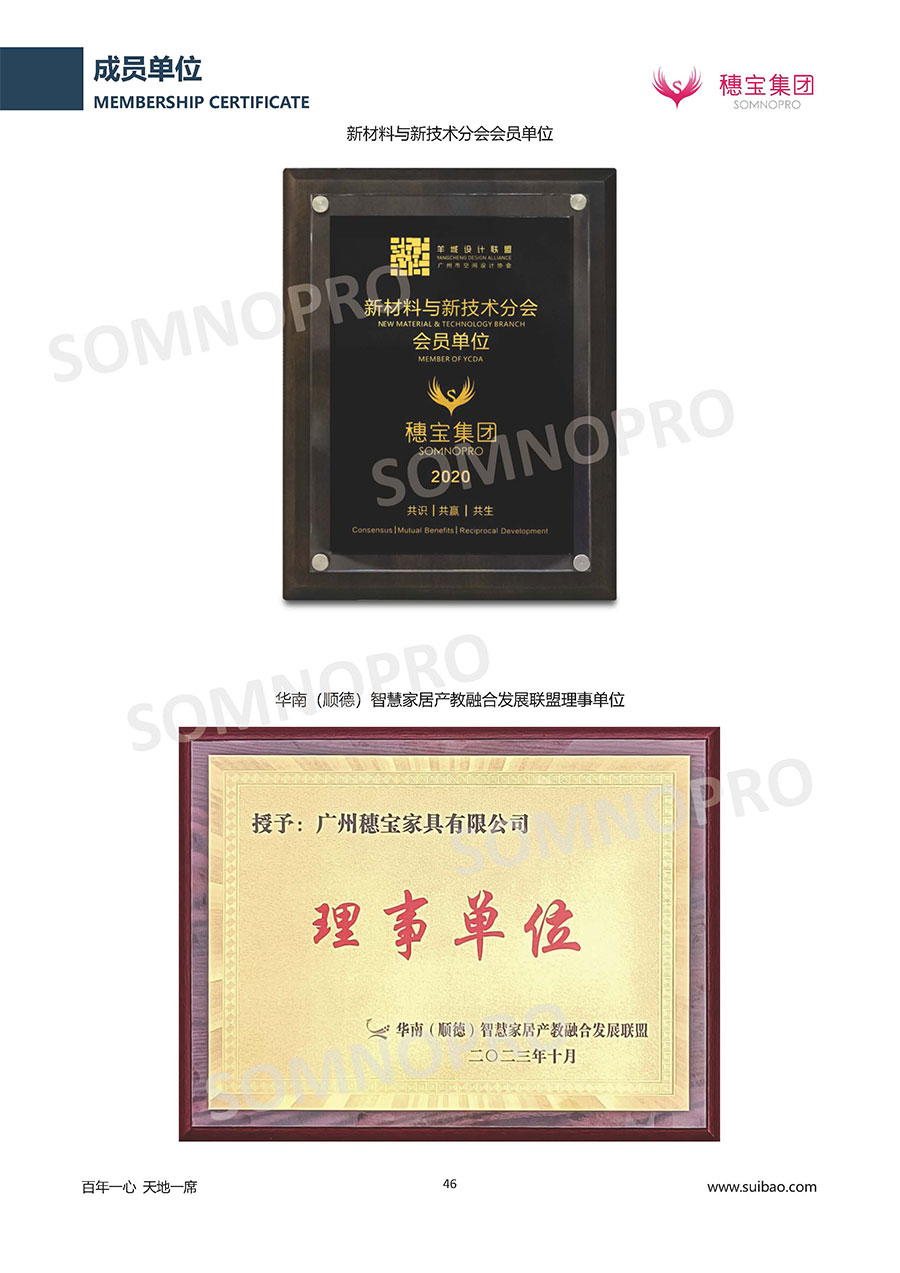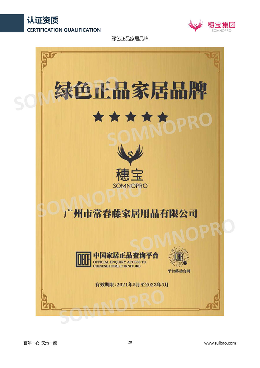 本著高品質(zhì)、高效率、重管理的原則,穗寶已通過(guò)ISO9001質(zhì)量管理體系認(rèn)證證書、ISO14001環(huán)境管理體系認(rèn)證證書、ISO45001職業(yè)健康安全管理體系認(rèn)證證書、中國(guó)環(huán)境標(biāo)志產(chǎn)品認(rèn)證證書、家居綠色環(huán)保領(lǐng)跑品牌、綠色正品家居品牌、企業(yè)標(biāo)準(zhǔn)“綠色領(lǐng)跑者”證書、CMS測(cè)量管理體系證書、CMS測(cè)量管理體系證書附件、廣東省“守信用重合同”企業(yè)、廣州歐亞-納稅信用A級(jí)納稅人(連續(xù)5年:2018-2022)、2024年中國(guó)500最具價(jià)值品牌,品牌價(jià)值高達(dá)302.89億元、廣東高價(jià)值商標(biāo)品牌(穗寶)、廣東省重點(diǎn)商標(biāo)保護(hù)名錄納入證明、廣州市勞動(dòng)關(guān)系和諧企業(yè)AA級(jí)。穗寶自創(chuàng)立以來(lái),不斷致力于新產(chǎn)品的設(shè)計(jì)與研發(fā),多次在國(guó)內(nèi)家具展會(huì)屢獲獎(jiǎng)項(xiàng),產(chǎn)品暢銷國(guó)內(nèi)外,深受客戶一致好評(píng)。