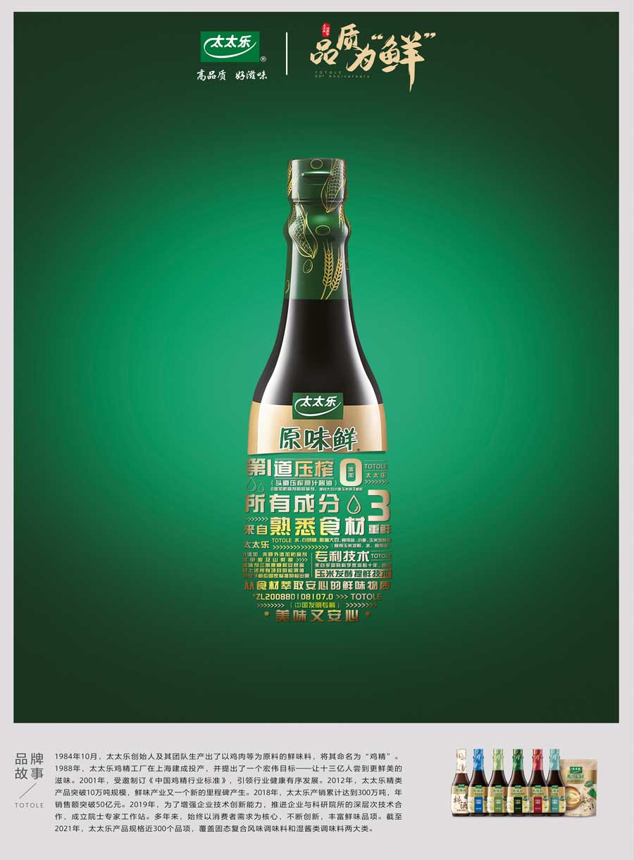 太太樂產(chǎn)品覆蓋固態(tài)復(fù)合風(fēng)味調(diào)味料和液態(tài)增鮮調(diào)味料兩大類的不同系列,多個子品牌,產(chǎn)品規(guī)格近300個品項。太太樂憑借雀巢體系的國際化管理體制、全球化質(zhì)量監(jiān)管體系、強(qiáng)大的研發(fā)實力和卓越的員工團(tuán)隊,依托以餐飲、零售、電商、出口為主的四大銷售渠道,銷售網(wǎng)絡(luò)覆蓋全國各地,并出口至美國、加拿大、日本、中東等國家和地區(qū)。作為鮮味科學(xué)倡導(dǎo)者,太太樂以“讓十三億人嘗到更鮮美的滋味”為企業(yè)愿景,持續(xù)鮮味行業(yè)革新升級。