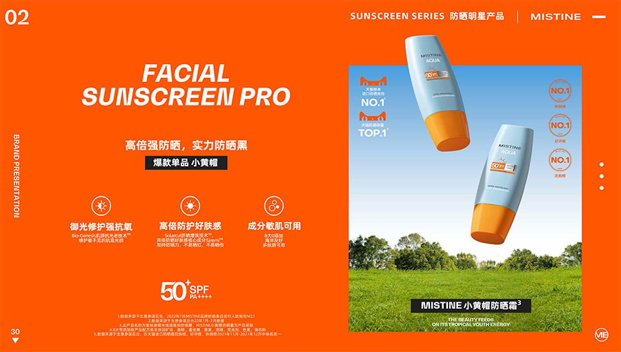 歷經超35年的科研沉淀,MISTINE蜜絲婷在防曬、護膚、底妝、彩妝多個品類的產品開發(fā)中,堅持圍繞對“光”的研究,在光與防曬護膚、光與色彩妝容的產品應用層面,研究光、理解光、樂享光,持續(xù)不斷地提供產品解決方案,滿足消費者對防曬美白、潮流妝容、護膚健康的需求。防曬系列產品作為MISTINE蜜絲婷的知名品類,以物化生一體的全鏈路防曬技術,憑借高倍防曬、清爽膚感的高功效和高質價比勝出,長期位于天貓進口防曬熱賣榜、回購榜、好評榜TOP1,天貓每銷售8支防曬霜,就有1支來自MISTINE蜜絲婷。