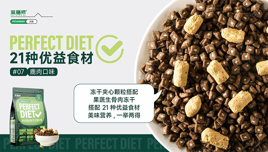 目前派膳師已擁有鮮食、零食、主糧等產品線,主打中高端主糧品類。全新(Perfect Diet)優(yōu)益膳食犬糧系列,倡導飲食多樣性,引入優(yōu)益食材(Superfood)理念,主打食材可見化,為國內狗狗提供更科學健康的多元化營養(yǎng)膳食。