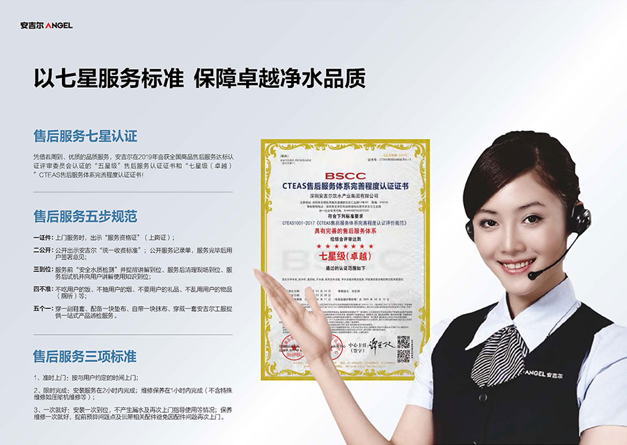 安吉爾擁有高標準的七星服務體系,服務覆蓋全國區(qū)縣2900+,全年每天24小時無間斷為用戶服務,全面保障飲用水安全。