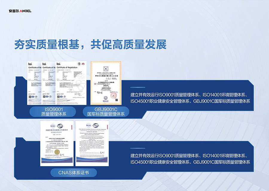 安吉爾擁有三大生產基地,其中安吉爾環(huán)境科技智慧園占地超60萬平方米,可實現(xiàn)年產1000萬臺(套)的凈飲水產品規(guī)模。安吉爾擁有完整的生產管理體系,已獲中國CQC、美國UL、美國NSF、加拿大CSA、法國BV、英國ITS、瑞士SGS和德國TüV全球八項權威機構認證。