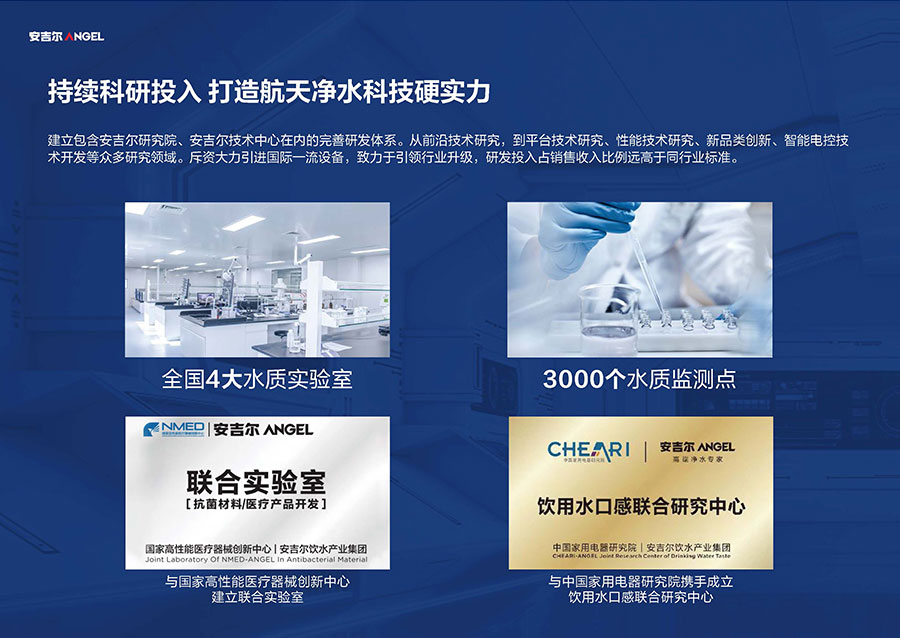 37年來,安吉爾始終堅持科技創(chuàng)新,不斷引領行業(yè)技術升級。參與17項國家及行業(yè)標準制修訂,累計獲得900余項專利,建立4大水質實驗室。2023年,安吉爾憑實力斬獲全球9項發(fā)明獎,包含3項日內瓦國際發(fā)明展獎項,6項亞洲創(chuàng)新發(fā)明展獎項。