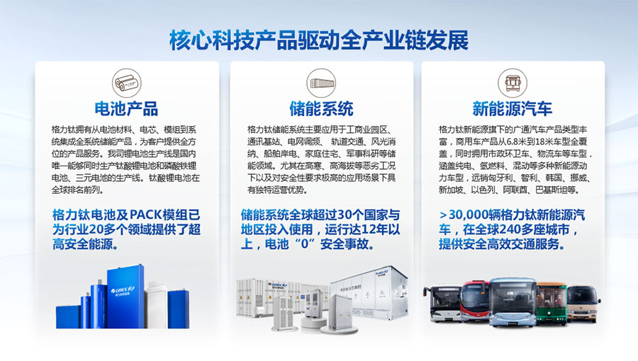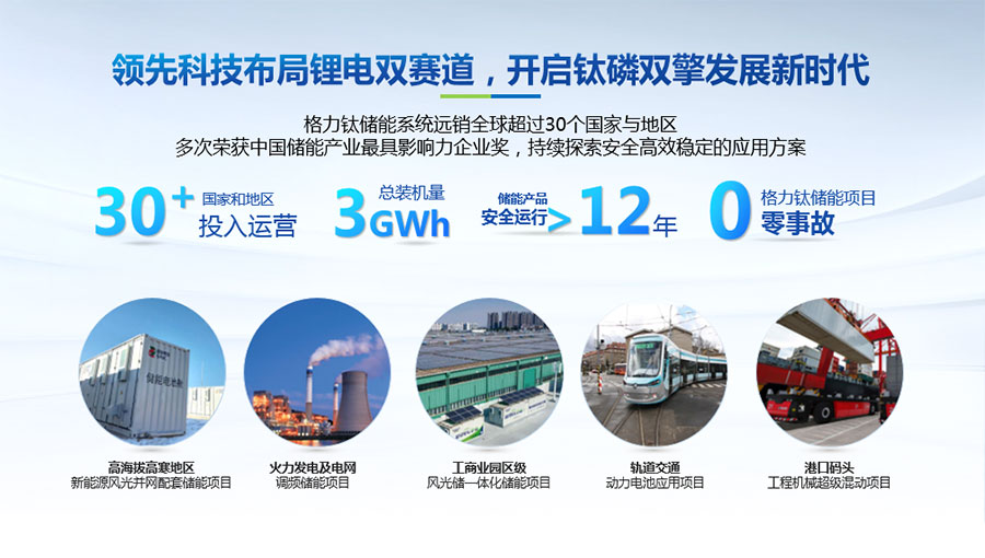 以完善的研發(fā)體系,公司加快技術(shù)創(chuàng)新與產(chǎn)業(yè)升級的步伐。公司研發(fā)的格力鈦電池安全性長期領(lǐng)跑行業(yè),憑借具有高安全、大倍率、快充放、耐寬溫、長壽命等特性,被選為“國家制造業(yè)單項冠軍產(chǎn)品”,廣泛應用于新能源汽車以及工商業(yè)園區(qū)、通訊基站、電網(wǎng)調(diào)頻、軌道交通、風光消納、船舶岸電、家庭住宅、軍事科研等儲能領(lǐng)域,具有廣闊的市場前景和應用價值。目前,格力鈦儲能產(chǎn)品已在丹麥、瑞士、芬蘭等全球30多個國家和地區(qū)使用,新能源汽車產(chǎn)品在北京、杭州、武漢、成都、青島、哈爾濱、包頭、??诘热?40多座城市運營,12年全球零電池事故安全運行。