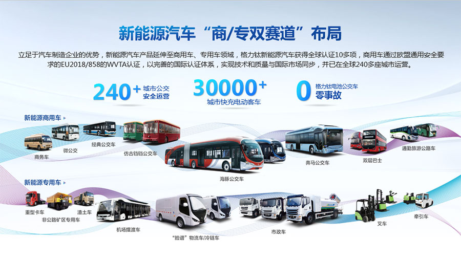 格力鈦新能源股份有限公司一直致力于研發(fā)混合動力、氫燃料、純電動車等一系列節(jié)能減排的新能源環(huán)保型客車/公交車/物流車,所研制產(chǎn)品體現(xiàn)了電子化、智能化、綠色化、節(jié)能化的鮮明特色,堅持以產(chǎn)品開發(fā)和市場開拓相結(jié)合的經(jīng)營方針,引進國外先進客車生產(chǎn)技術(shù),力爭通過資本、技術(shù)及產(chǎn)業(yè)優(yōu)勢,做大區(qū)域市場,進軍國際市場,力爭成為中國新能源汽車的領(lǐng)軍企業(yè)集團。