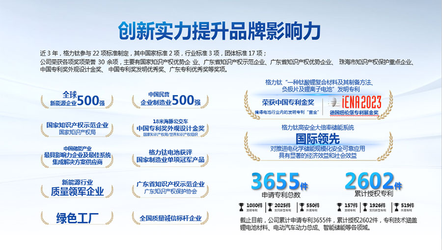 2022年,“一種鈦酸鋰復合材料及其制備方法、負極片及鋰離子電池”發(fā)明專利獲得中國專利金獎,摘得鋰電池行業(yè)內(nèi)的發(fā)明專利“首金”;2023年,該專利技術(shù)再次斬獲第75屆德國紐倫堡發(fā)明國際金獎。“高安全大倍率儲能系統(tǒng)關(guān)鍵技術(shù)研發(fā)與應用”項目被中國機械工業(yè)聯(lián)合會鑒定達到“國際領(lǐng)先”水平。截止目前,公司先后獲得“中國民營企業(yè)制造業(yè)500強”、“全國質(zhì)量信得過產(chǎn)品”、“客車安全技術(shù)成果獎”、“中國儲能產(chǎn)業(yè)最具影響力企業(yè)獎、最佳系統(tǒng)集成商、最佳儲能電池供應商”等榮譽,獲得工信部頒發(fā)的“綠色工廠”榮譽稱號;上榜科技部發(fā)布的新能源領(lǐng)域獨角獸企業(yè),多年入選全球新能源企業(yè)500強,入選“全國百佳質(zhì)量檢驗誠信標桿企業(yè)”、“國家知識產(chǎn)權(quán)優(yōu)勢企業(yè)”等。