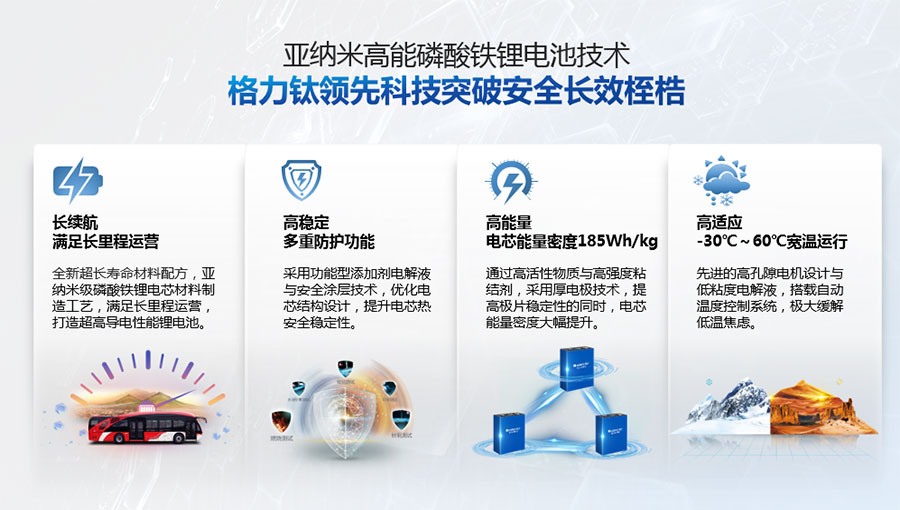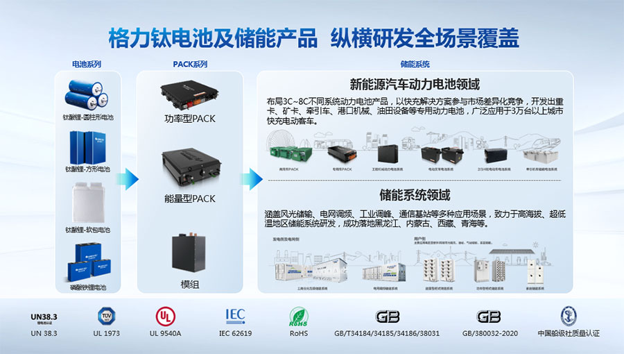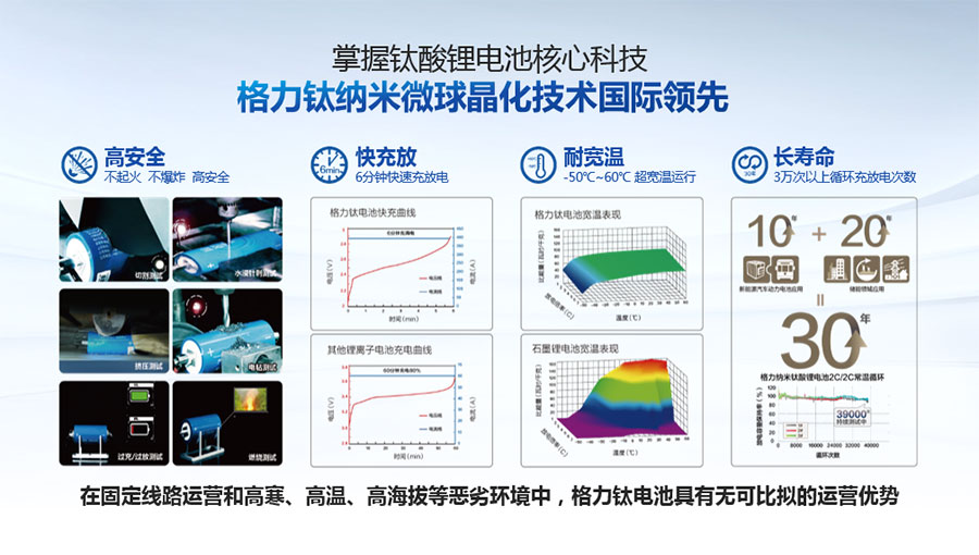 鈦酸鋰電池技術(shù)是新能源行業(yè)唯一獲得中國專利獎金獎的鋰電池產(chǎn)品技術(shù),其應用于儲能電池和動力電池具有超高安全性,在快充放、耐寬溫、長壽命等方面同樣具有卓越的性能。格力鈦電池系列產(chǎn)品具有不起火不爆炸高安全、6分鐘快充放、-50℃至60℃耐寬溫特性,循環(huán)充放電次數(shù)高達30000多次,使用壽命長達30年。格力鈦電池經(jīng)利鋸切割、尖針穿刺、強力擠壓、電鉆沖孔、短路充放電、高溫加熱、槍擊等極限條件測試,均未發(fā)生冒煙、起火、燃燒、爆炸等現(xiàn)象。