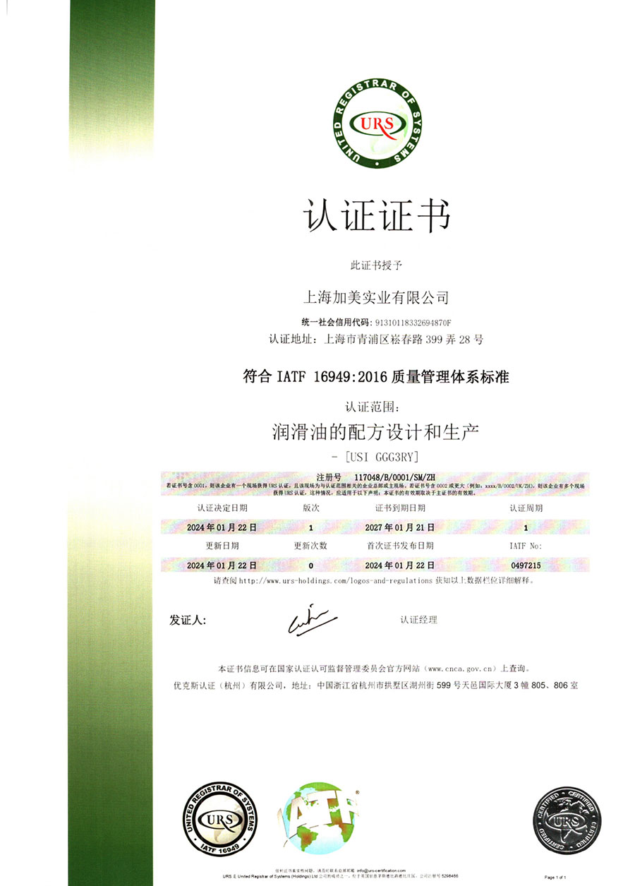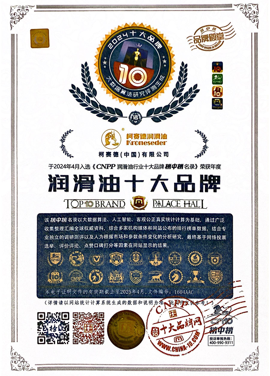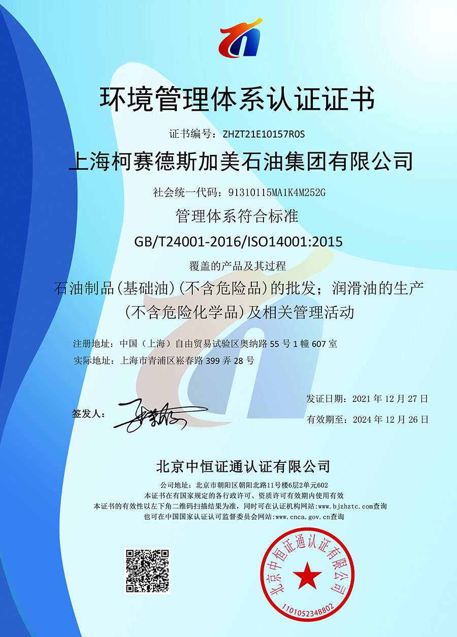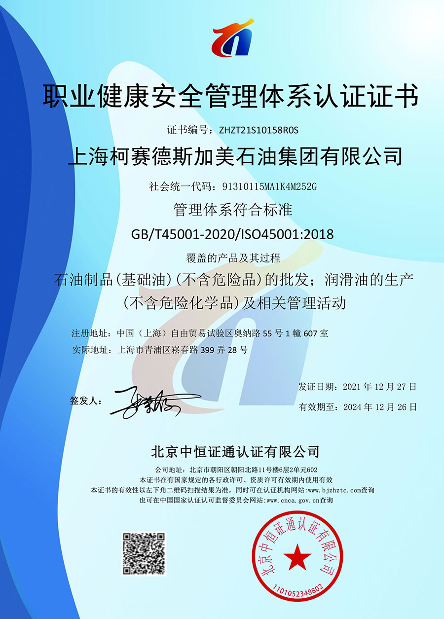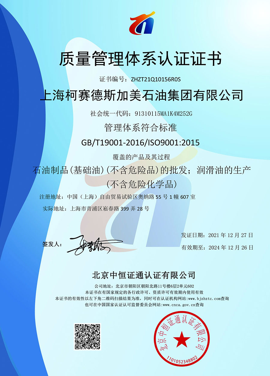 柯賽德斯集團公司統(tǒng)一遵循嚴格的質量保證體系,先后通過了武器裝備質量管理體系認證GJB9001C-2017、ISO/TS16949、IS09001質量體系認證、1S014001環(huán)境體系認證及ISO45001:2018職業(yè)健康安全管理體系認證。隨著業(yè)務領域的不斷擴展,目前柯賽德斯集團公司先后與多家世界能源、化工方面的巨頭建立了產品服務、供應保障、技術合作、技術特別支持單位等方面的戰(zhàn)略合作關系。今天,柯賽德斯集團公司旗下管理著三大潤滑油品牌,實現(xiàn)了經(jīng)營上的多元化戰(zhàn)略格局。