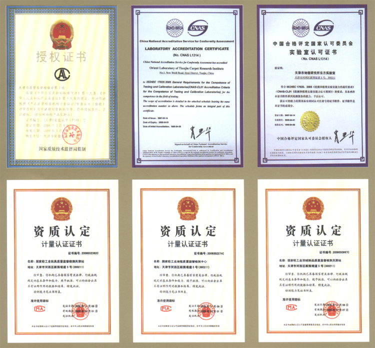 國家地毯質(zhì)量監(jiān)督檢驗中心籌建于1987年,于1988年、1991年相繼通過了國家技術(shù)監(jiān)督局的計量認證考核和審查認可,是國家技術(shù)監(jiān)督局依法授權(quán)的國家級產(chǎn)品質(zhì)量監(jiān)督檢驗機構(gòu)。1999年、2003年和2006年又相繼通過了CNACL、CNAL和CNAS中國合格評定國家認可委員會和國家認證認可監(jiān)督管理委員會對實驗室資格“三合一”的復查認可和授權(quán)。