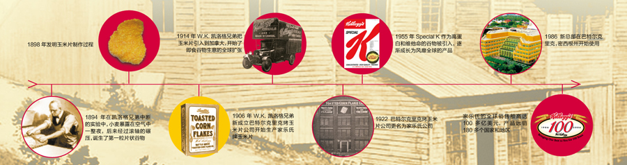 一百多年來,家樂氏公司秉承“更健康、更營養(yǎng)美味和更高質(zhì)量”的信念以及“天然和優(yōu)質(zhì)”的高尚品質(zhì),不斷地推陳出新,先后推出系列經(jīng)典 產(chǎn)品如All-Bran®(1916年)和 Rice Krispies®(1928年)。隨著業(yè)務的發(fā)展,家樂氏公司開始拓展國際業(yè)務:1914年Kellogg’s Corn Flakes®產(chǎn)品進軍加拿大市場,1924年和1938年分別在澳大利亞的悉尼、英格蘭的曼徹斯特設(shè)立工廠。2007年,家樂氏成功進入中國,并以銷售額接近120億美金的業(yè)績成為全球谷物食品和方便食品的領(lǐng)頭者,產(chǎn)品包括谷物類早餐、餅干、克力架、糕點、果味小食、燕麥餅干棒、冷凍華夫以及素食產(chǎn)品等。2012年6月,家樂氏在全球成功收購品客品牌,使家樂氏的休閑產(chǎn)品成為繼谷物產(chǎn)品之后的第二大品牌。