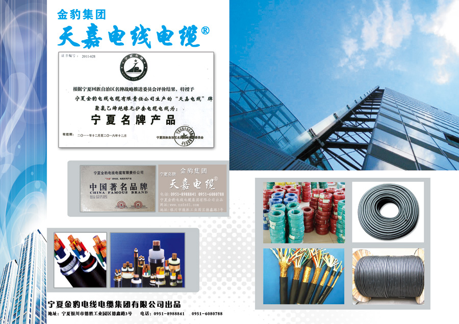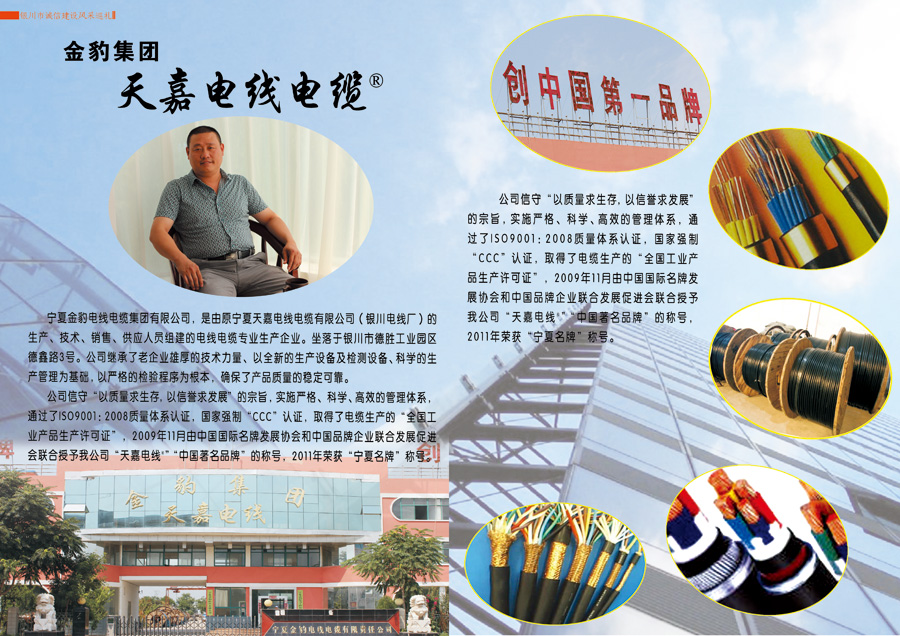 公司信守“以質(zhì)量求生存,以信譽(yù)求發(fā)展”的宗旨,實(shí)施嚴(yán)格、科學(xué)、高效的管理體系,通過了ISO9001:2008質(zhì)量體系認(rèn)證,國(guó)家強(qiáng)制“CCC”認(rèn)證,取得了電纜生產(chǎn)的“全國(guó)工業(yè)產(chǎn)品生產(chǎn)許可證”,2009年由中國(guó)國(guó)際名牌發(fā)展協(xié)會(huì)和中國(guó)品牌企業(yè)聯(lián)合發(fā)展促進(jìn)會(huì)聯(lián)合授予公司“天嘉電線®”“中國(guó)著名品牌”的稱號(hào),2011年榮獲“寧夏名牌”稱號(hào)。公司是寧夏質(zhì)量管理協(xié)會(huì)副會(huì)長(zhǎng)單位、銀川市質(zhì)量管理協(xié)會(huì)理事單位、賀蘭縣質(zhì)量管理協(xié)會(huì)理事單位、中國(guó)電器工業(yè)協(xié)會(huì)電線電纜分會(huì)會(huì)員單位。