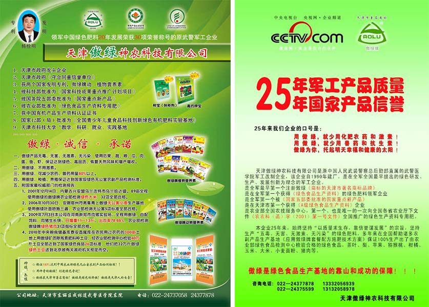 傲綠公司堅(jiān)持“以質(zhì)量求生存,靠信譽(yù)謀發(fā)展”的企業(yè)宗旨,一定讓全國(guó)的農(nóng)民朋友:用神奇的傲綠,創(chuàng)造綠色奇跡!