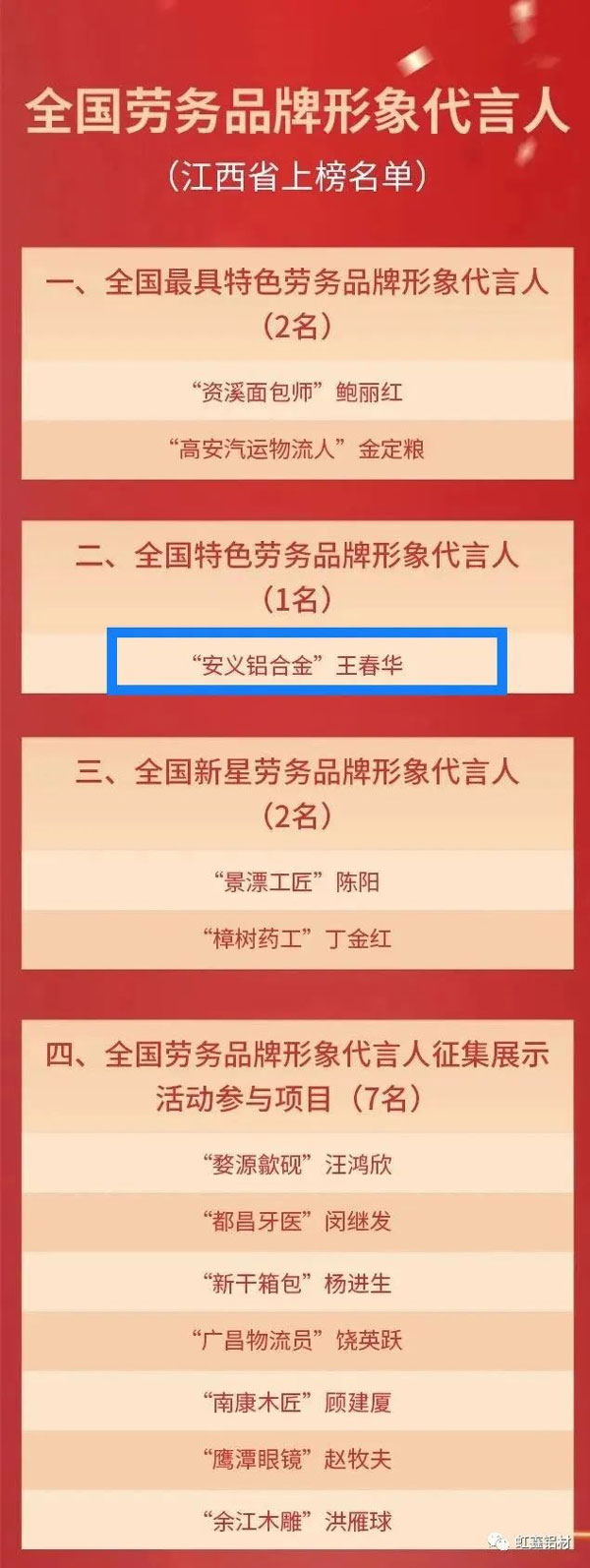 江西省虹鑫鋁業(yè)有限公司董事長王春華榮獲全國勞務(wù)品牌安義鋁合金形象代言人稱號(hào)