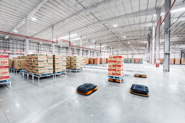 衛(wèi)龍倉庫內(nèi),智能AGV小車正在快速將產(chǎn)品搬運到指定位置。