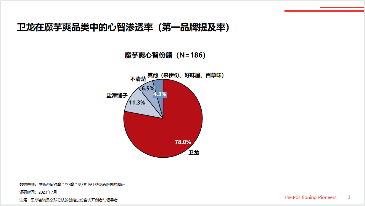 根據(jù)里斯咨詢(xún)的調(diào)研顯示,衛(wèi)龍憑借魔芋爽在同品類(lèi)中的心智滲透率已達(dá)78%,遠(yuǎn)超其他品牌。就在日前,衛(wèi)龍魔芋爽在淘寶平臺(tái)上取得了“淘寶100W+”的銷(xiāo)售成績(jī),拿下淘寶首屆“金桃子獎(jiǎng)”,足以彰顯其在市場(chǎng)上的強(qiáng)大影響力。