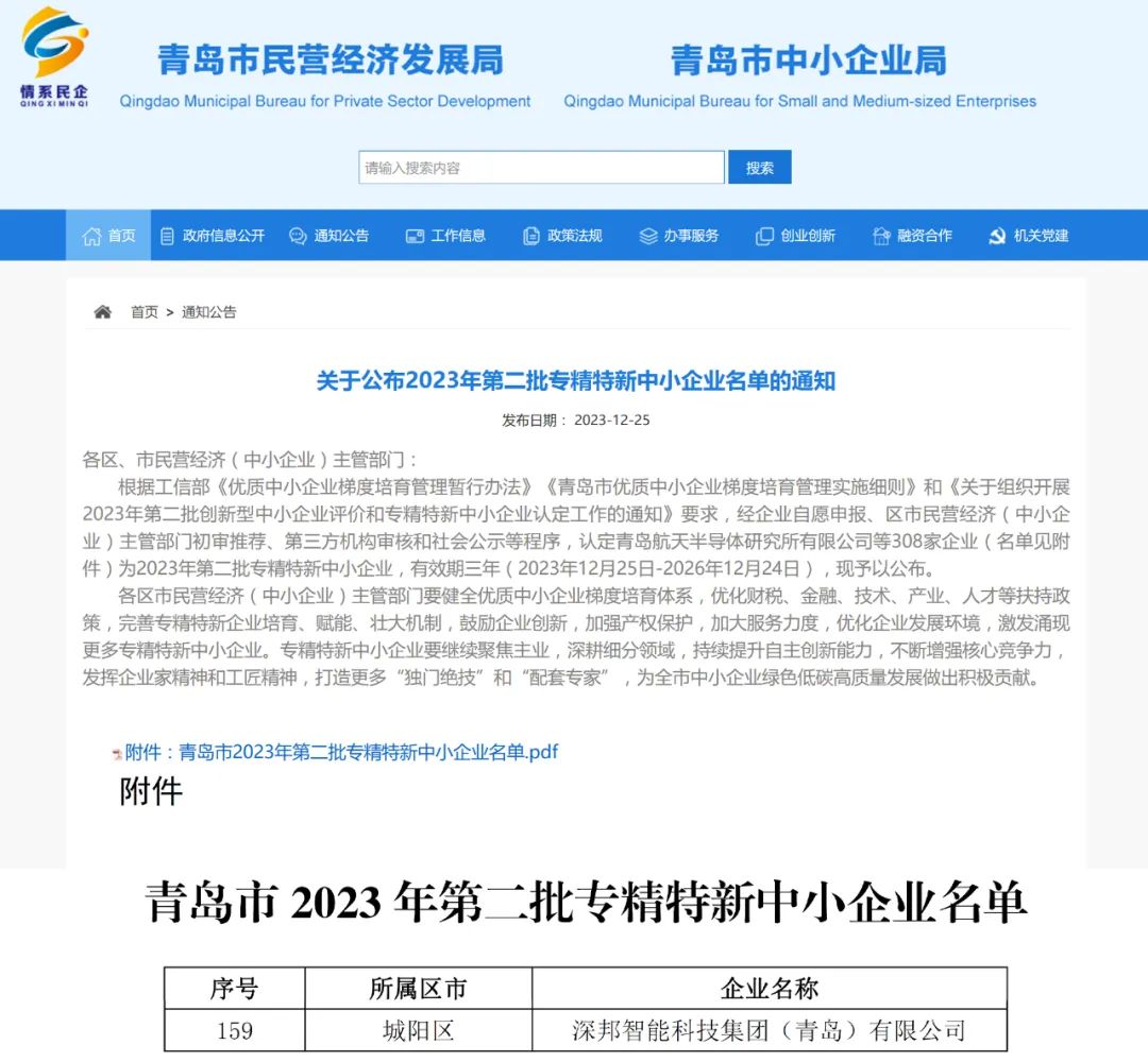12月25日,青島市民營(yíng)經(jīng)濟(jì)發(fā)展局發(fā)布了《關(guān)于公示2023年第二批專(zhuān)精特新中小企業(yè)名單的通知》,深邦集團(tuán)憑借卓越的創(chuàng)新技術(shù)、完善的產(chǎn)品體系、高效的運(yùn)營(yíng)模式以及穩(wěn)健的經(jīng)營(yíng)實(shí)力順利通過(guò)層層審核,獲評(píng)2023年第二批“專(zhuān)精特新”中小企業(yè)。