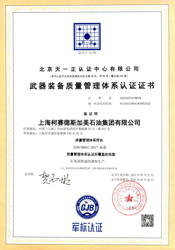 柯賽德斯加美石油集團(tuán)取得軍標(biāo)認(rèn)證