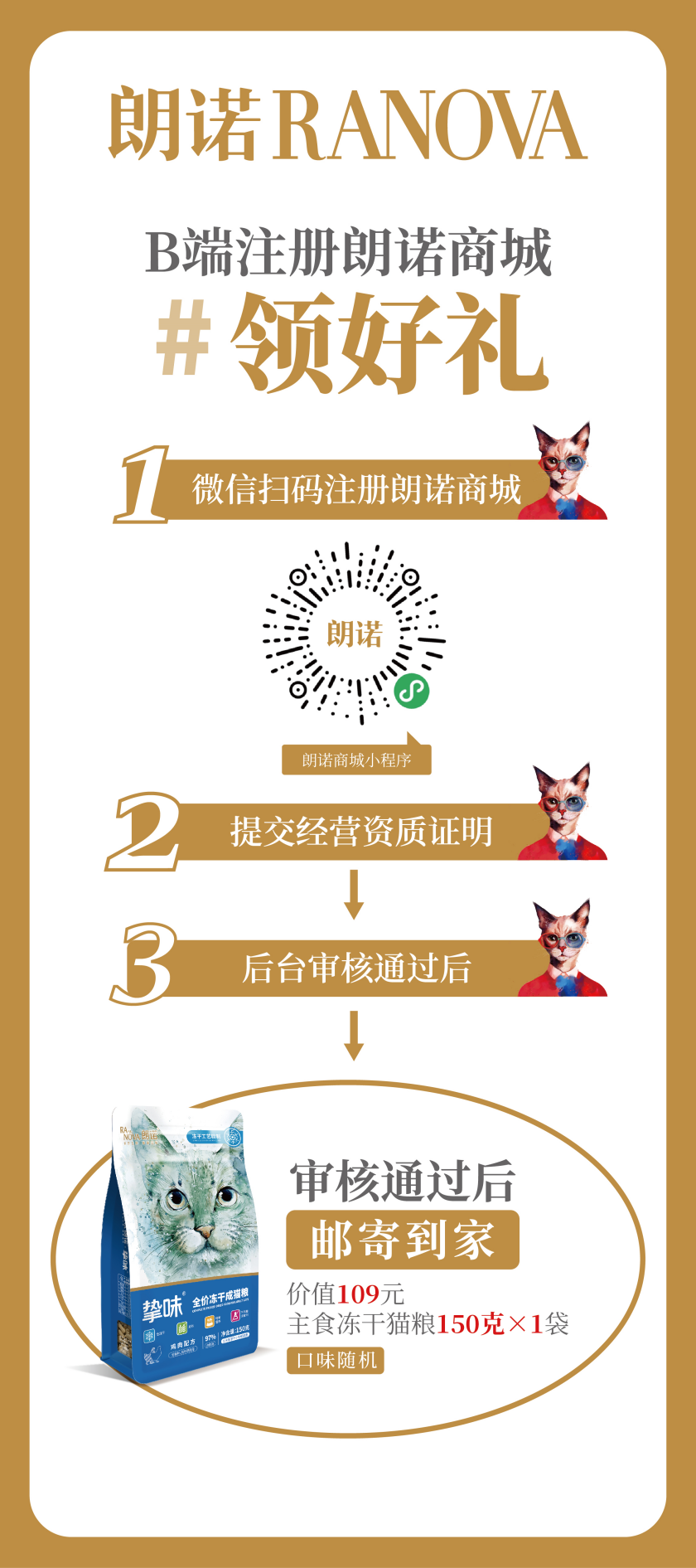 朗諾誠(chéng)邀各位B端客戶,微信掃碼注冊(cè)“朗諾商城”或者微信搜索“朗諾商城”,按步驟上傳資質(zhì),審核通過(guò),即可獲得朗諾準(zhǔn)備的精品好禮一份:朗諾主食凍干150克(口味隨機(jī))一袋,直接包郵到家。同時(shí)我們還為“朗諾商城”的各位客戶,定制超值價(jià)格政策,進(jìn)貨不費(fèi)力,敬請(qǐng)期待。