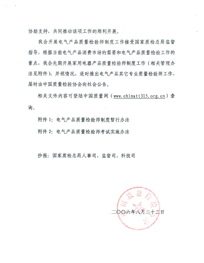 關(guān)于開展電氣產(chǎn)品質(zhì)量檢驗(yàn)師制度工作的通知