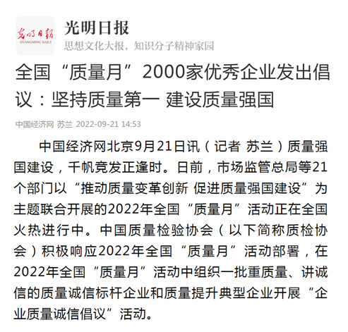 光明日報客戶端:全國“質(zhì)量月”2000家優(yōu)秀企業(yè)發(fā)出倡議:堅(jiān)持質(zhì)量第一 建設(shè)質(zhì)量強(qiáng)國