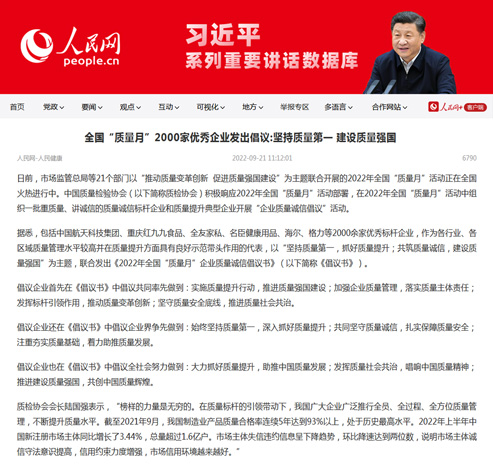 人民網(wǎng):全國“質(zhì)量月”2000家優(yōu)秀企業(yè)發(fā)出倡議:堅(jiān)持質(zhì)量第一 建設(shè)質(zhì)量強(qiáng)國