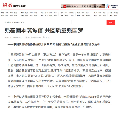 網(wǎng)易網(wǎng):強(qiáng)基固本筑誠信 共圓質(zhì)量強(qiáng)國夢——中國質(zhì)量檢驗(yàn)協(xié)會組織開展2022年全國“質(zhì)量月”企業(yè)質(zhì)量誠信倡議活動