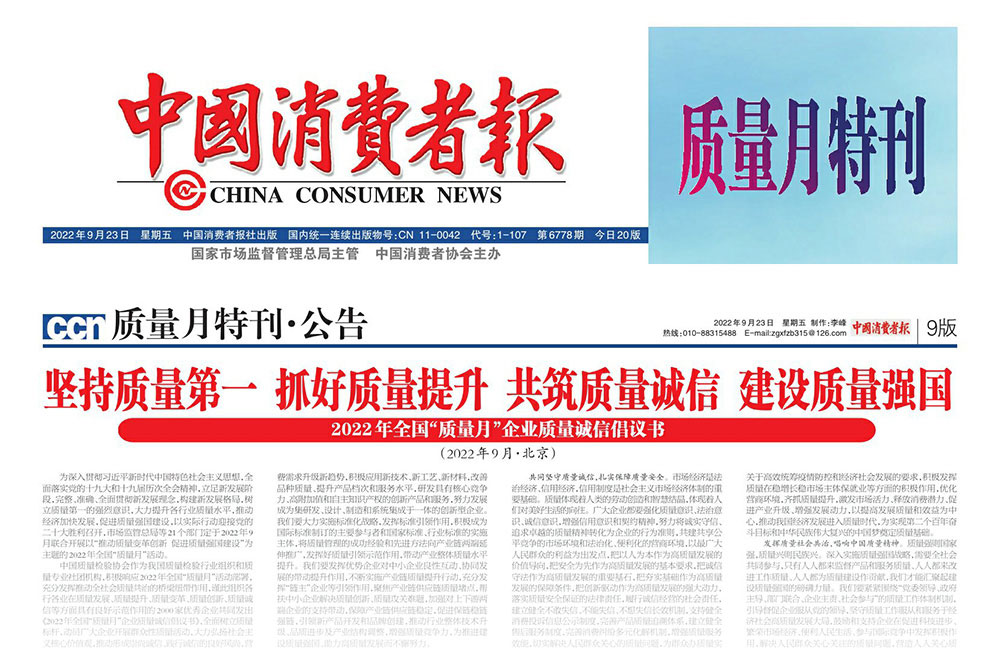中國消費(fèi)者報:堅(jiān)持質(zhì)量第一 抓好質(zhì)量提升 共筑質(zhì)量誠信 建設(shè)質(zhì)量強(qiáng)國