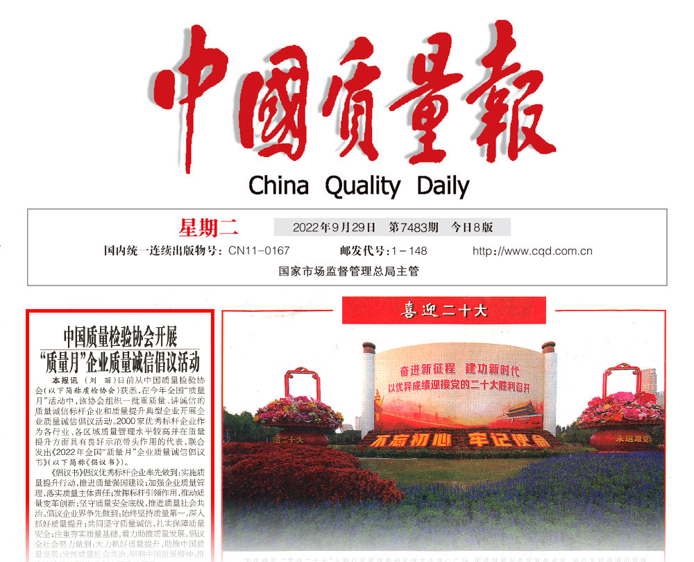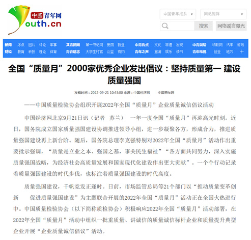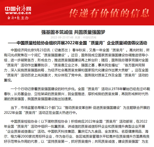 中國經(jīng)濟(jì)網(wǎng):匯聚力量攜手抓好質(zhì)量提升 肩負(fù)使命促進(jìn)質(zhì)量強(qiáng)國建設(shè)——2022年全國“質(zhì)量月”企業(yè)質(zhì)量誠信倡議活動綜述